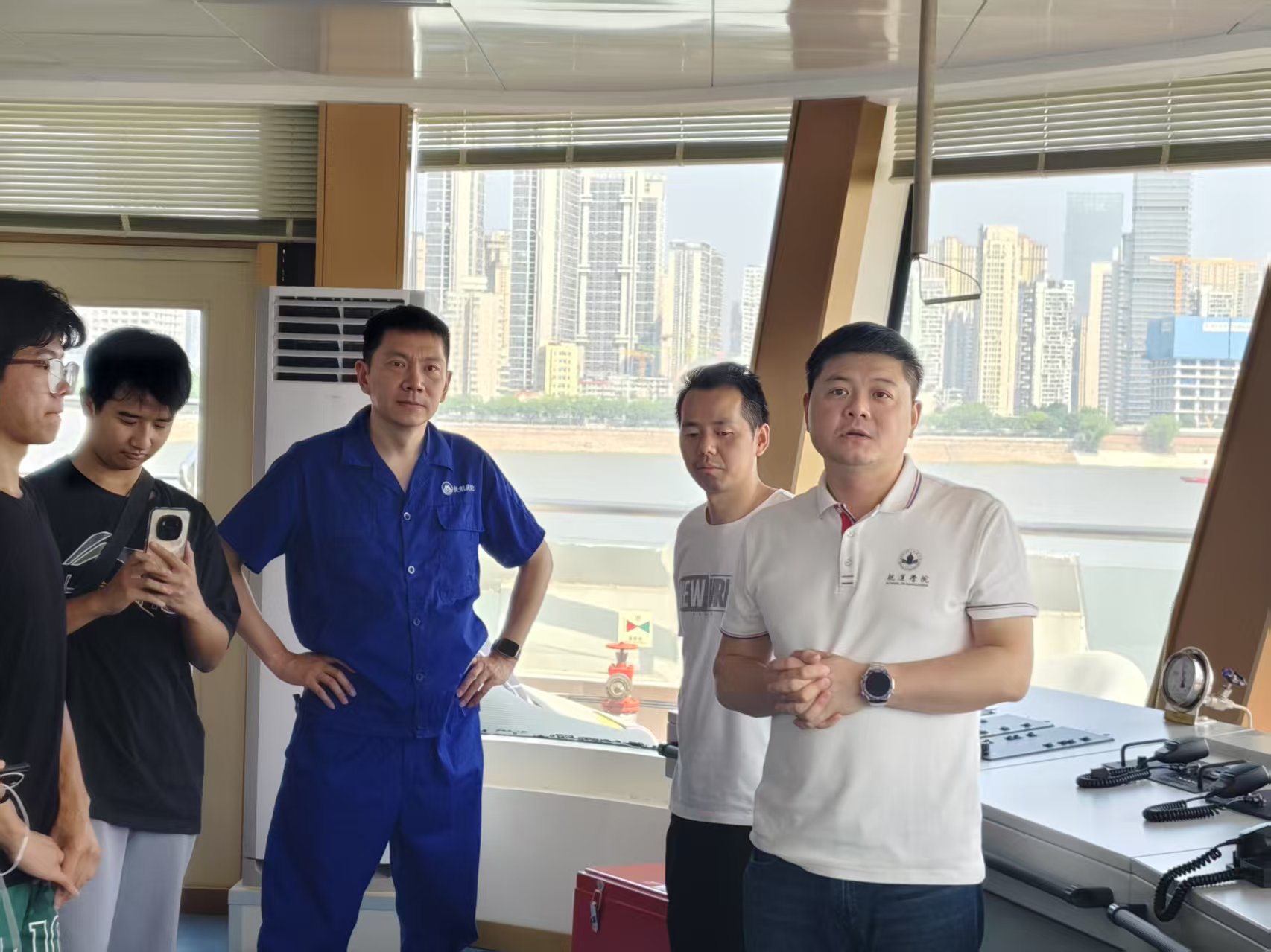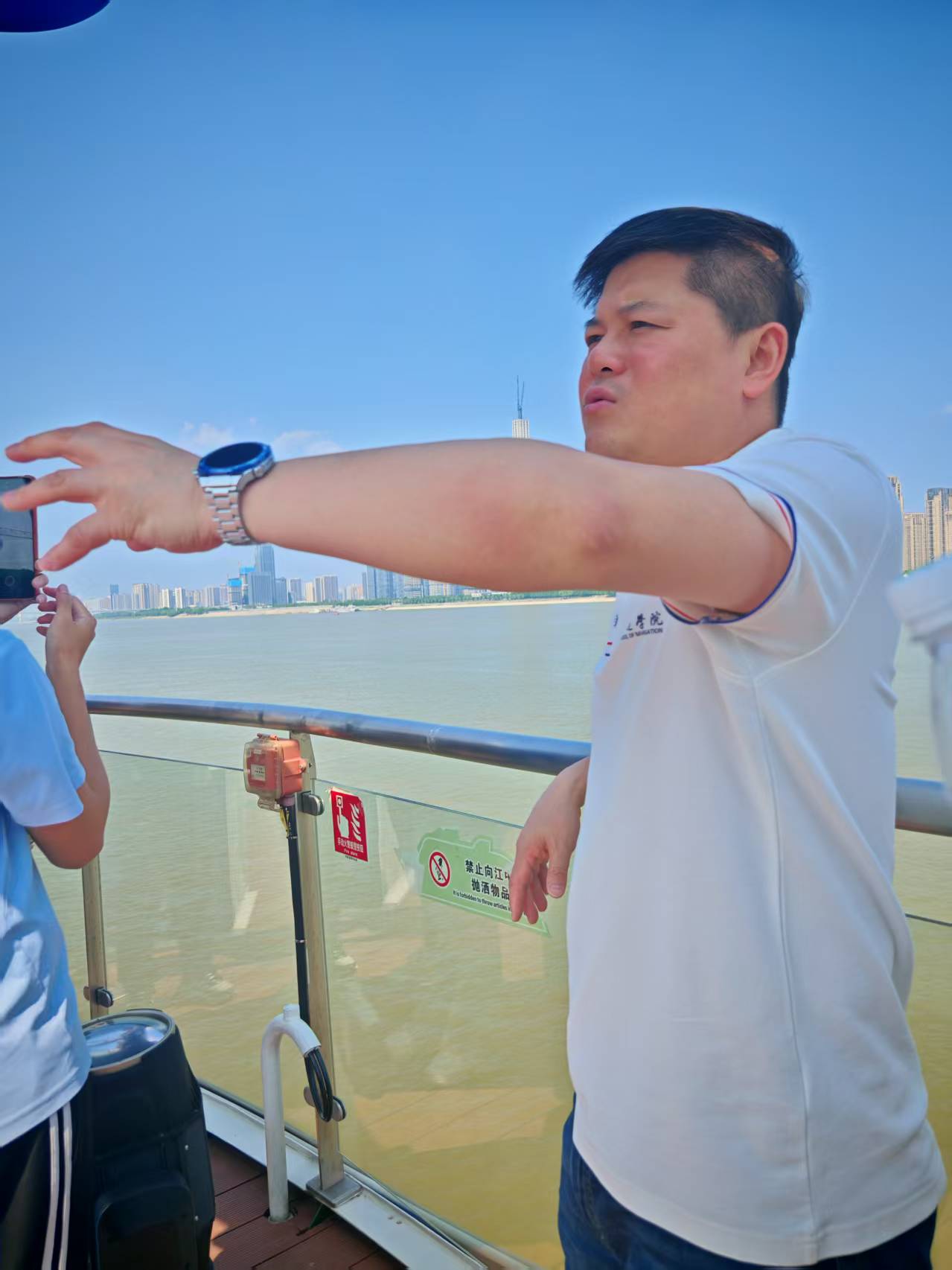 在甲板上张帆老师依托壮阔江景展开深度教学,他向同学们讲述海事相关知识,如长江之上的避碰原则与船舶行驶规则,并以一艘引航船为例,阐述其功能与重要性。刘奕老师补充道:长江干线货运量占全国内河运量70%,读懂这段黄金水道,就读懂了中国内河航运的命脉。老师们的讲解引发阵阵惊叹。
