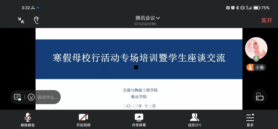 12月28日下午,成人免费影片联合交通与物流工程成人免费影片在交通物流成人免费影片308会议室开展寒假母校行培训及经验交流活动,寒假母校行浙江、福建、宜昌、荆门的小队成员,以线上线下相结合的形式参加了本次培训,本次培训由交通与物流工程成人免费影片辅导员郑智予老师主持。